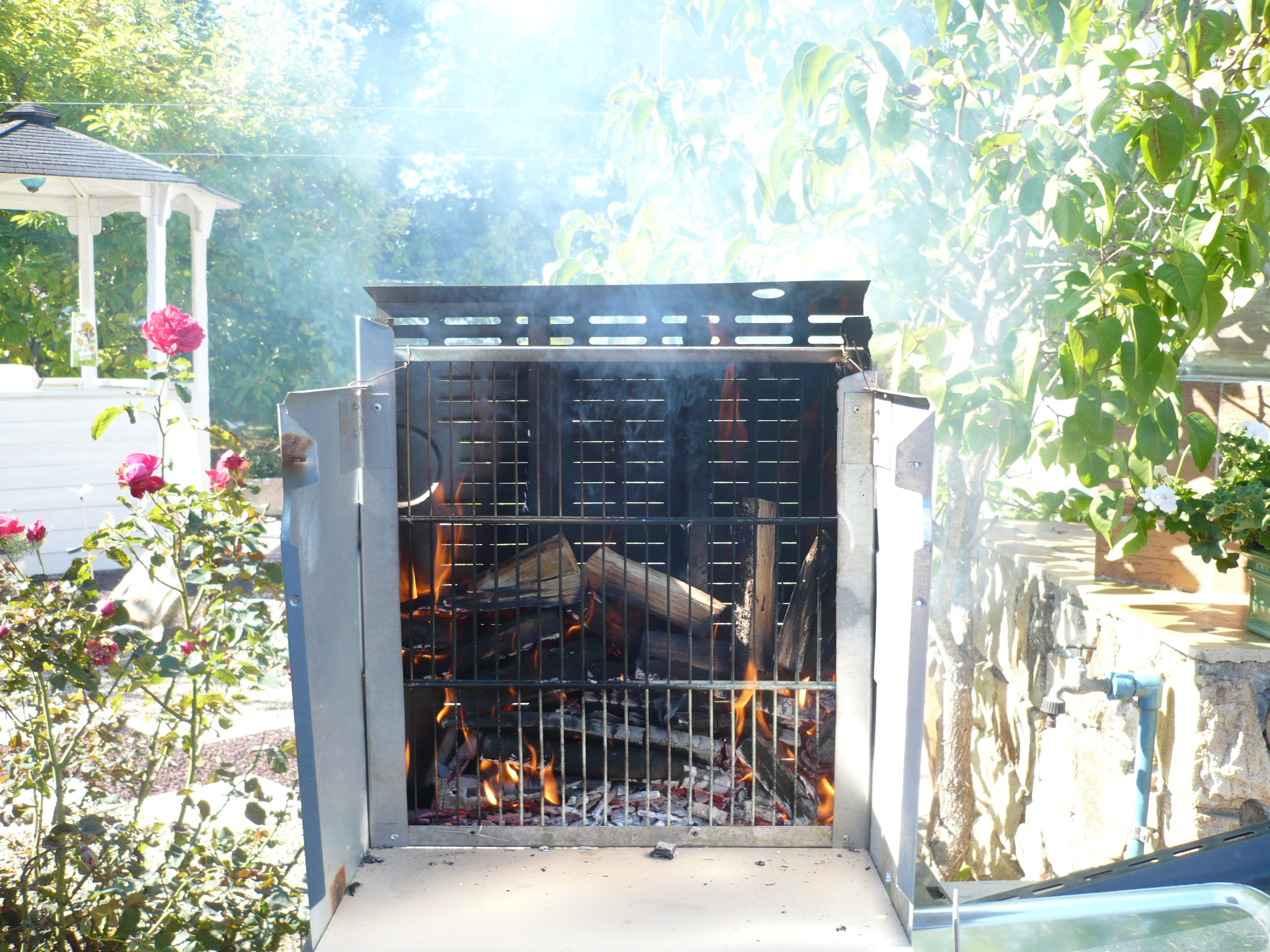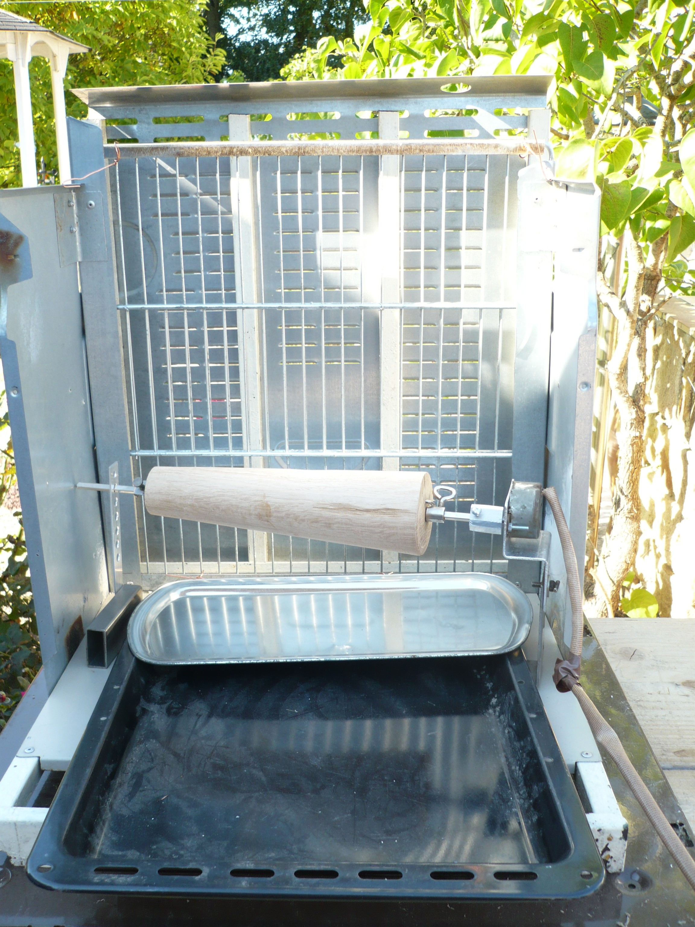 - On le dresse sur le tourne- broche (moteur 2 tours mn) avec le feu de braise à l’arrière.